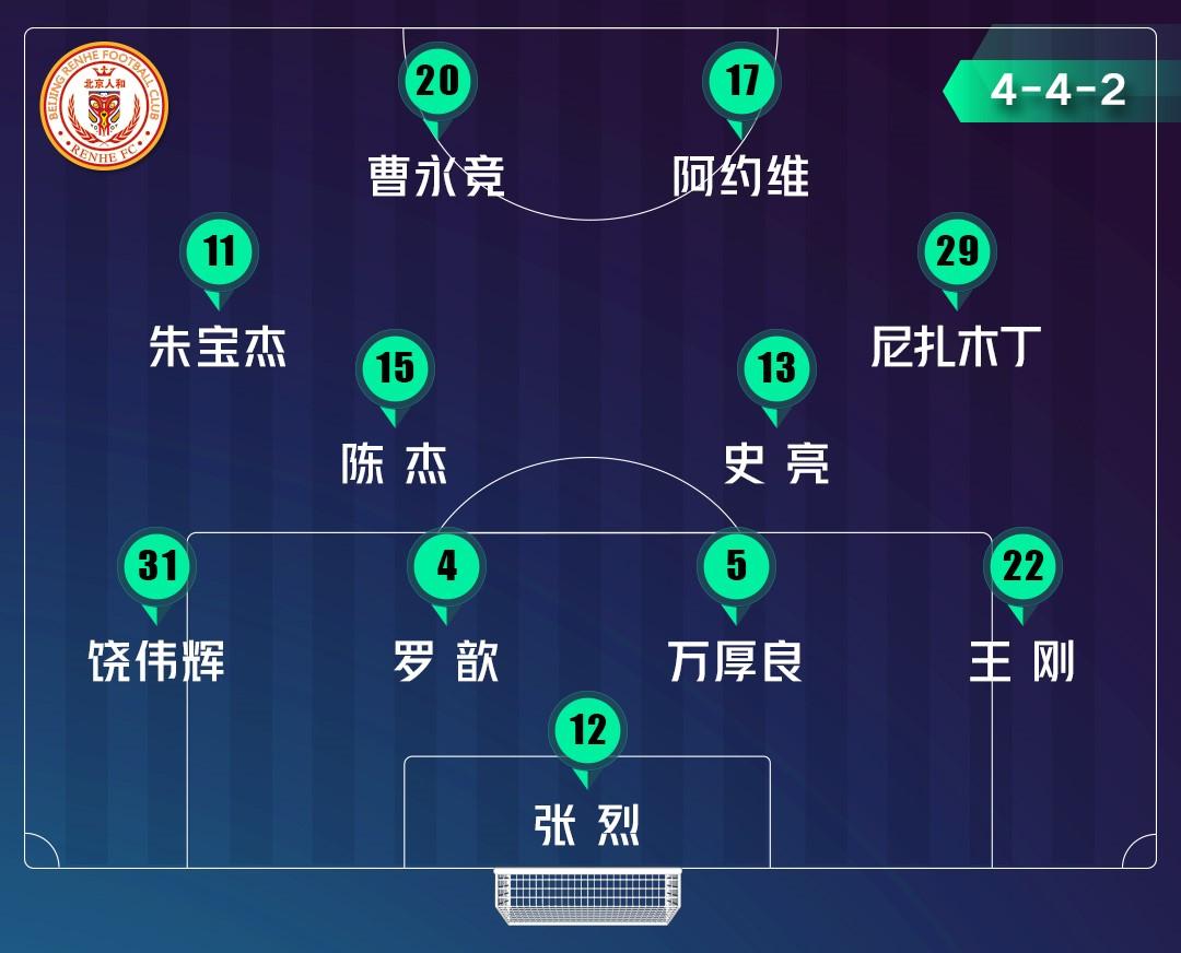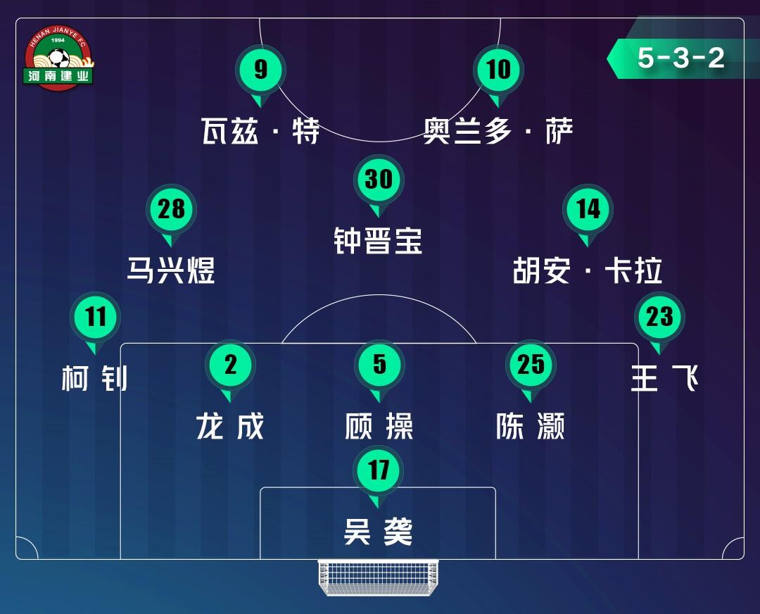 河南建业首发: 29-韩锋、2-龙成、16-杨阔、15-郑仁焕、4-戈麦斯、7-肖智(30'35-梁雨)、8-尹鸿博、14-买提江、19-张可、33-毕津浩、20-萨哈拉
