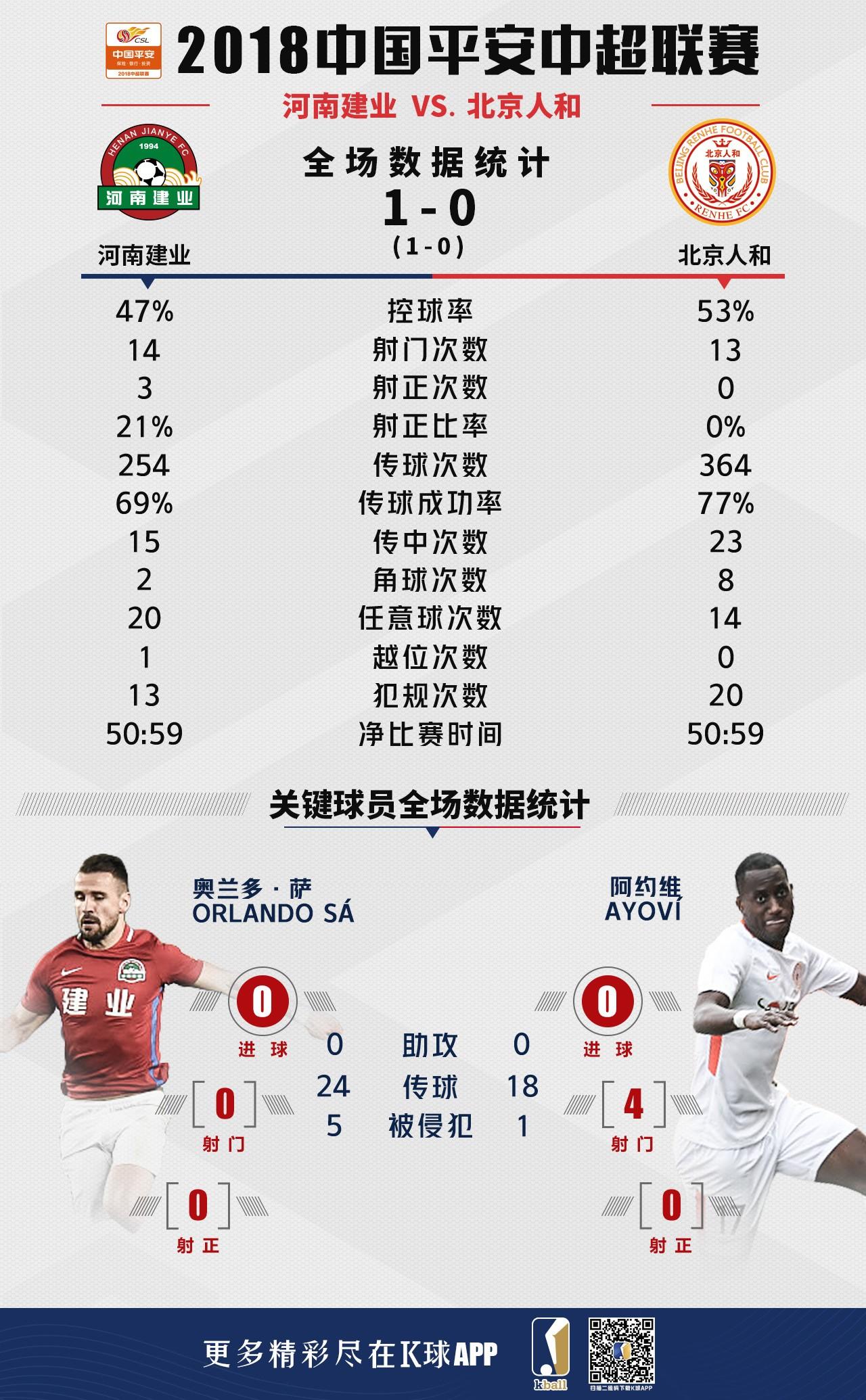 从本场比赛两队的全场数据统计对比中可以看出,北京人和队虽然在控球率和传球数据上有着一定的优势,不过在射门效率上,全场比赛竟然是无一射正。另外值得一提的是北京人和队此役仅上了一名外援,伊沃和奥古斯托两位绝对主力的缺席在很大程度上影响了球队的攻守转换能力,实际进攻的质量上却大不如从前,缺少了奥古斯托的人和在空中争抢同样处于下风。上半场比赛河南建业队正是通过任意球的前点后蹭,随后跟进的球员将球轻松打入。