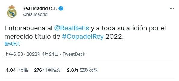 皇马官方祝贺道:祝贺贝蒂斯以及他们的球迷,他们值得今年的国王杯冠军。