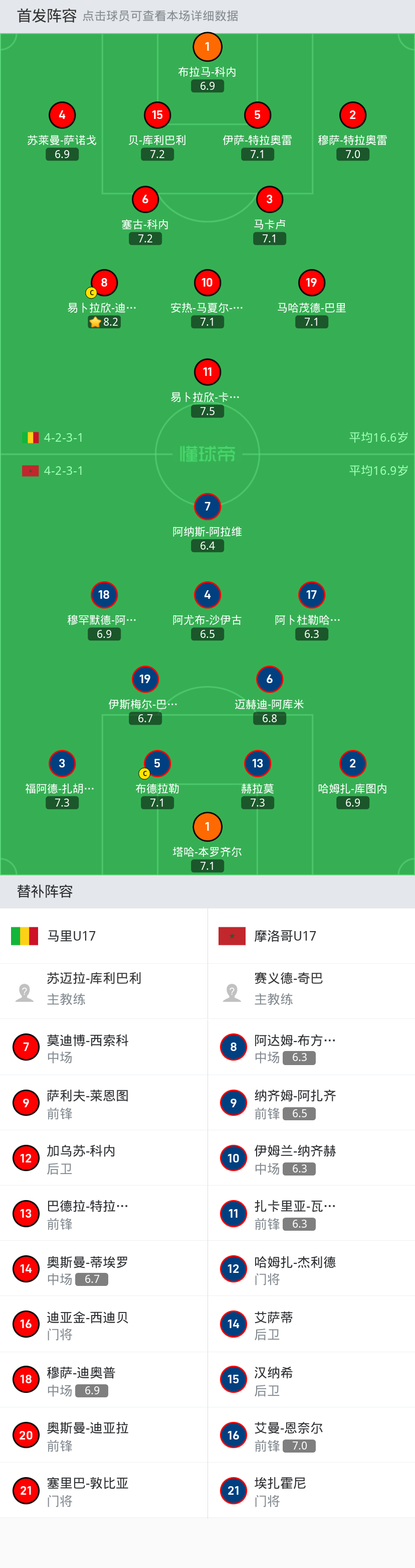 马里U17 首发:15-贝-库利巴利, 11-易卜拉欣-卡纳特, 5-伊萨-特拉奥雷, 1-布拉马-科内, 4-苏莱曼-萨诺戈, 6-塞古-科内, 8-易卜拉欣-迪亚拉, 19-马哈茂德-巴里, 2-穆萨-特拉奥雷, 10-安热-马夏尔-蒂亚, 3-马卡卢