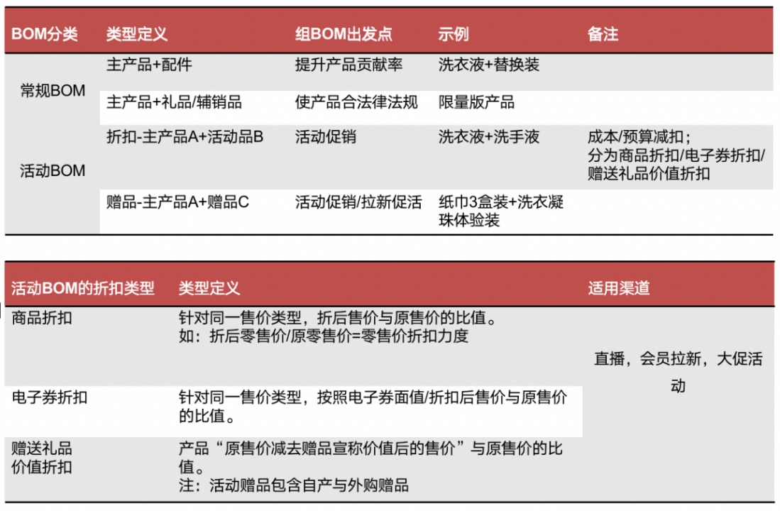 1)组合类型较明确,分常规/活动BOM;针对活动BOM的折扣类型管理较明确;BOM适用的主要渠道较为明晰。