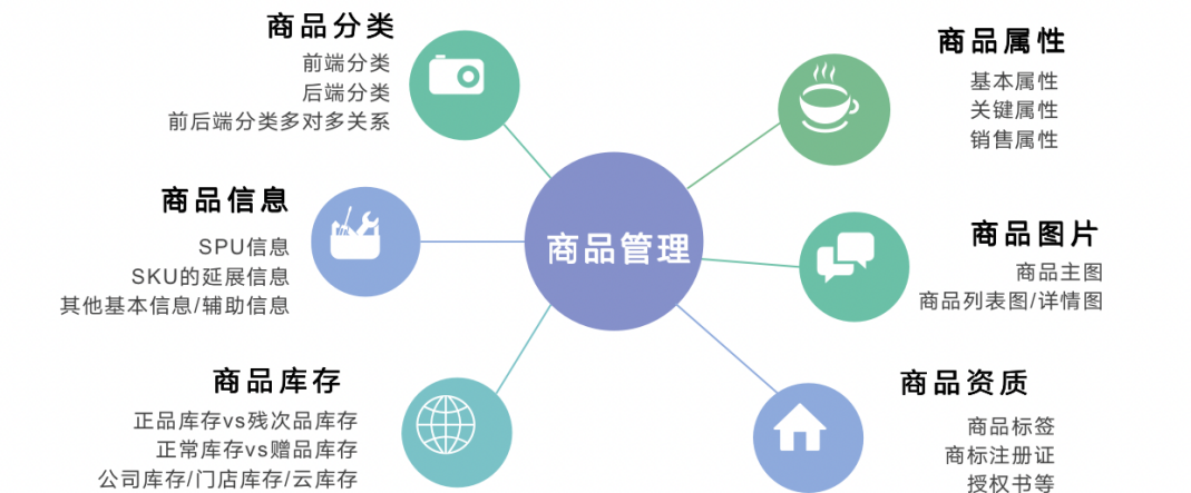 活动方选品时,组BOM需求由各团队提出,相互之间信息独立。核对商品信息,或统计同款商品整体销量时,容易遗漏,核对困难。活动方选品时,很难拿到过往组BOM数据,不清楚产品与那些产品搭配的销量和效果好,制定组BOM方案的时只能重新规划思考,效率低,没有办法持续提升。一个产品升级/改版后(容量变化,口味变化,或者年版不同),无法统计/或归属到原来的产品。目前主流商品管理维度:包括商品分类/商品属性/商品信息/商品图片/商品库存/商品资质;具体如下图所示: