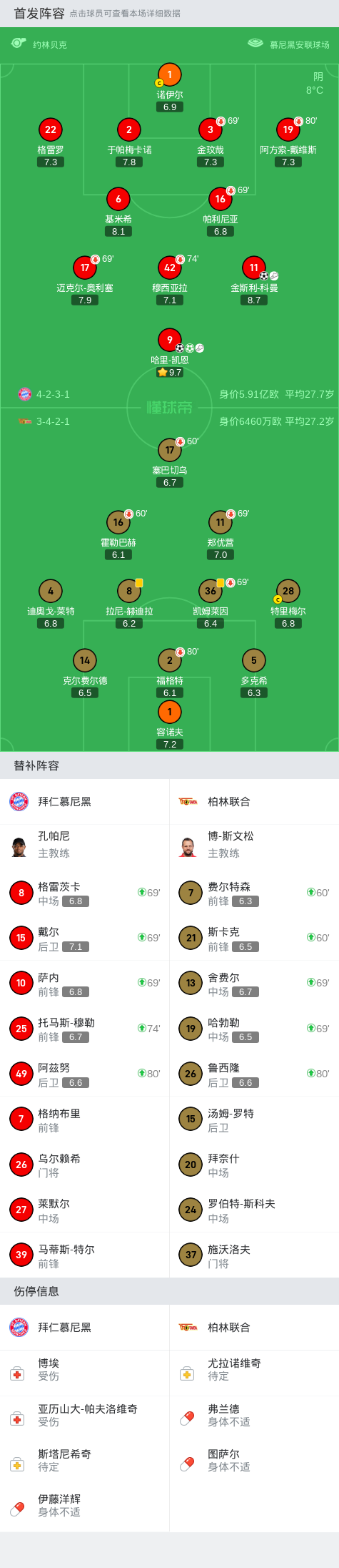 拜仁慕尼黑 首发:哈里-凯恩, 金斯利-科曼, 迈克尔-奥利塞, 基米希, 帕利尼亚, 穆西亚拉, 于帕梅卡诺, 格雷罗, 阿方索-戴维斯, 金玟哉, 诺伊尔