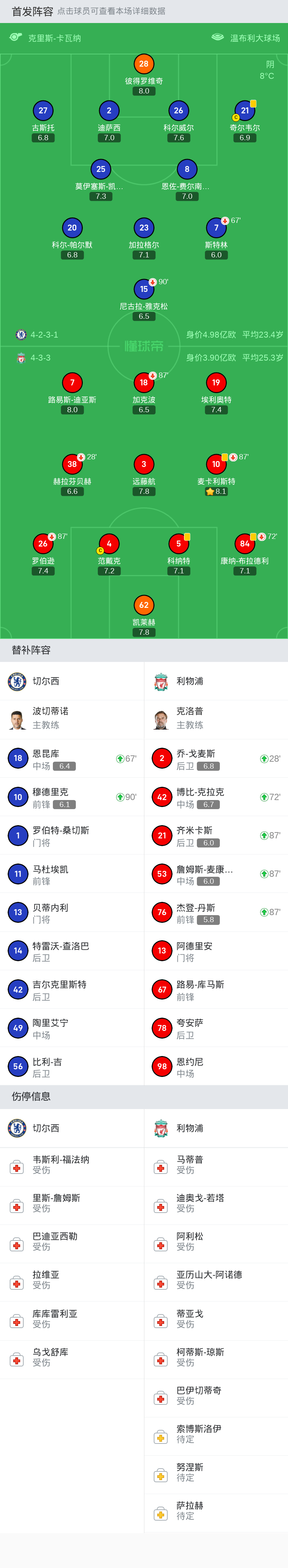 替换下场:87'26-罗伯逊, 87'18-加克波, 87'10-麦卡利斯特, 28'38-赫拉芬贝赫, 72'84-康纳-布拉德利