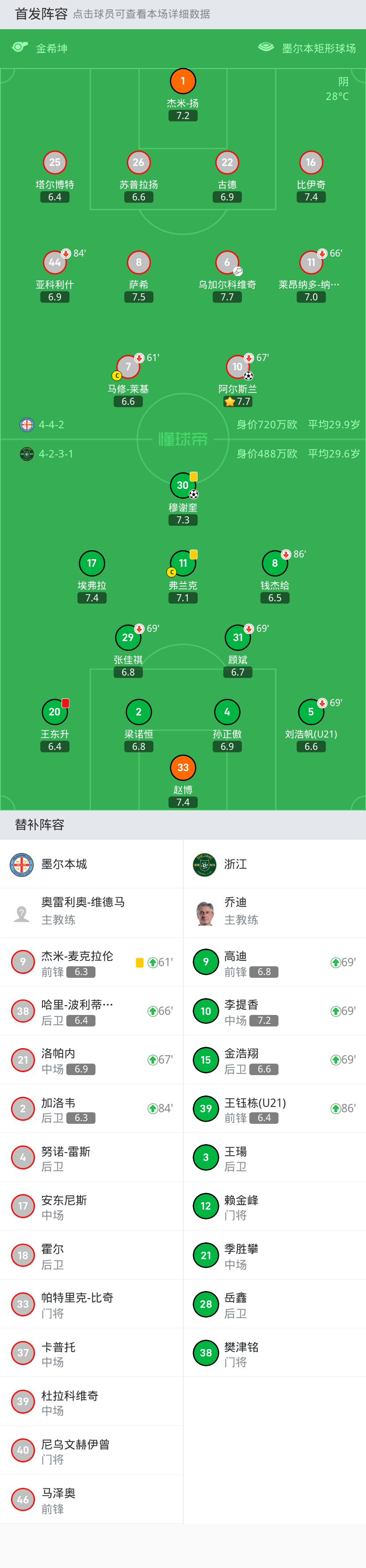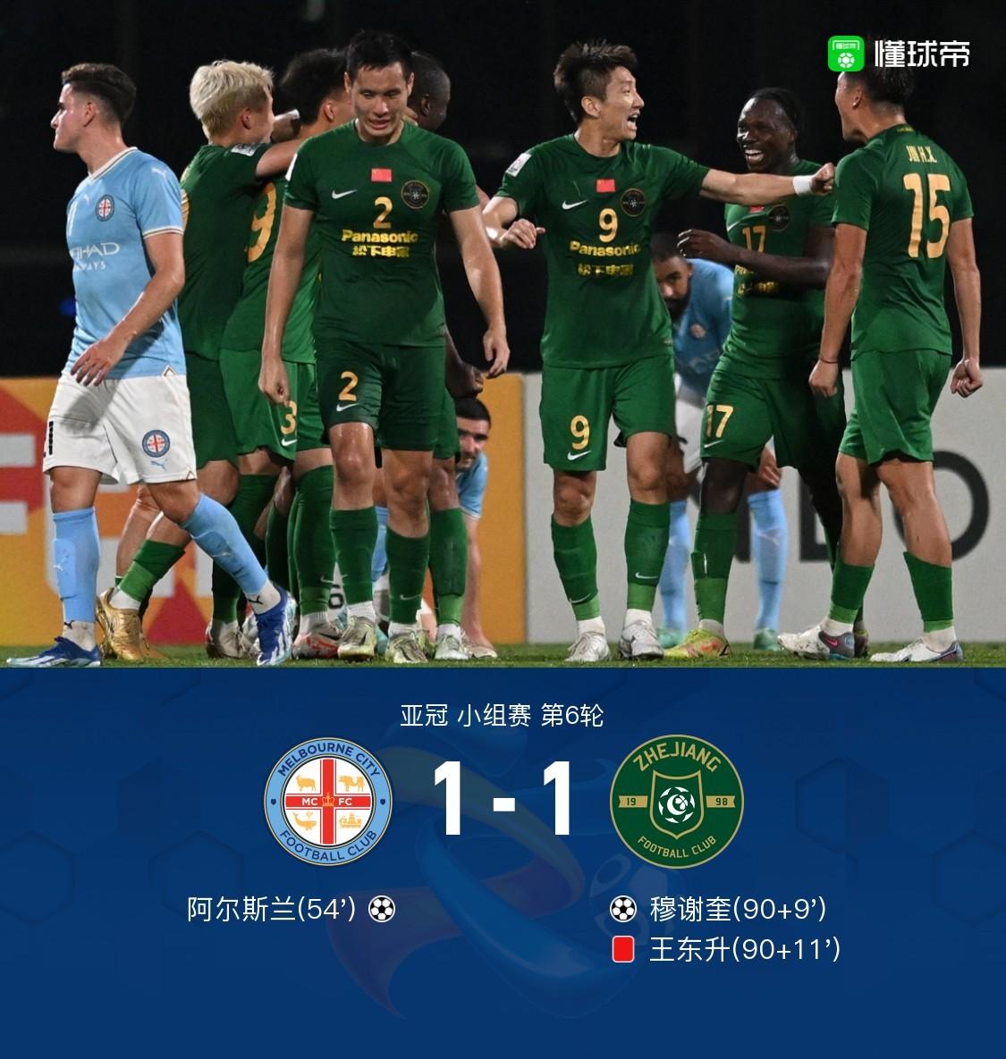 北京时间12月12日17:30,亚冠小组赛H组第6轮,浙江作客卡尔顿王子公园球场挑战墨尔本城,本场主裁判为韩国人金希坤。上半场,埃弗拉与顾斌的打门被没收,浙江开场21分钟便三人染黄。下半场,阿尔斯兰打破僵局,穆谢奎第99分钟头槌绝平,紧接着王东升肘击染红。最终,浙江客场1-1战平墨尔本城,居小组第三无缘出线。