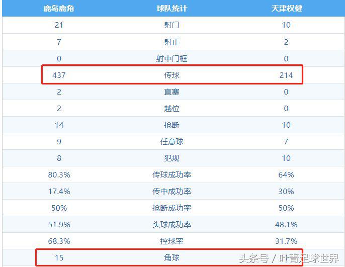 全场比赛,天津权健全面落后,控球率31.7%,全场比赛仅有1次角球机会,鹿岛鹿角则有15次,角球之比1-15, 这样的进攻对比堪称悬殊,足以可见,权健在边路突破上几乎没有威胁。角球机会寥寥无几,高中锋杨旭,中卫权敬源的抢点能力就无法得到充分施展。