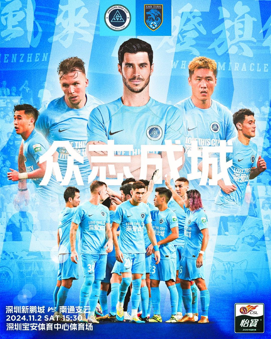直播吧11月2日讯 今天15点30分,中超末轮,深圳新鹏城主场迎战南通支云,赛前双方公布首发阵容。