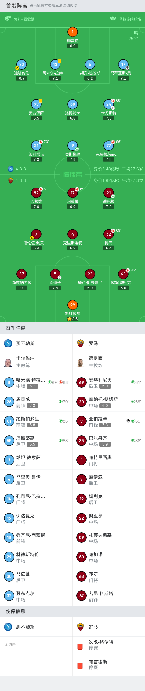 那不勒斯首发:1-梅雷特、59-扎诺利、13-拉马尼、26-库利巴利、6-马里奥-鲁伊、8-法比安-鲁伊斯(67'4-德姆)、68-洛博特卡(56'20-泽林斯基)、99-赞博-安古伊萨、11-洛萨诺(67'7-埃尔马斯)、9-奥斯梅恩(81'14-梅尔滕斯)、24-因西涅(81'5-胡安-热苏斯)