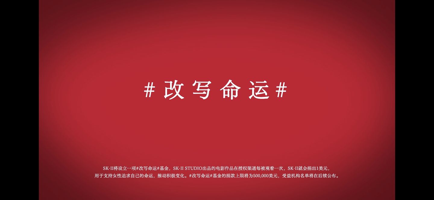 作为“改写命运”品牌活动一部分,SK-II 将在今年设立“改写命运”基金,SK-II STUDIO 出品的电影作品在授权渠道每被观看一次,SK-II 就会捐出 1 美元,捐款上限将为 500,000 美元,用于支持女性追求自己的命运,推动积极变化。