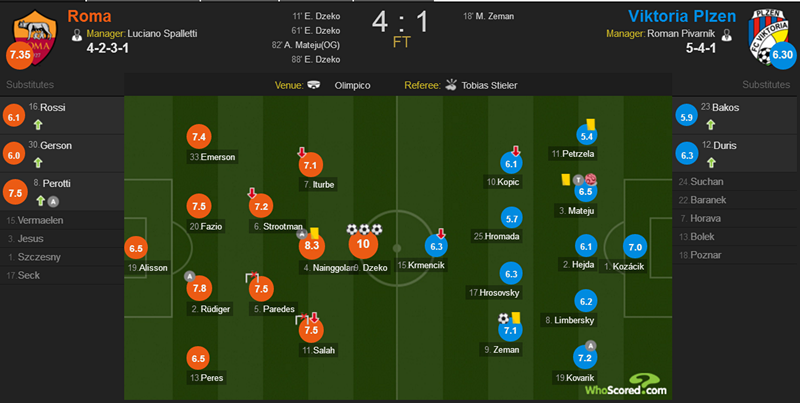 罗马此前积8分排名小组第1,本场比赛他们只要1分便可提前出线;比尔森胜利此前仅取得1场胜利小组垫底,如果本场无法取胜,他们将惨遭淘汰。值得一提的是,两队首回合交锋战成1-1平。首发方面,哲科单箭头突前,萨拉赫与伊图尔韦分居两翼,托蒂则替补待命;比尔森胜利则由克尔门切克担任攻城锤。