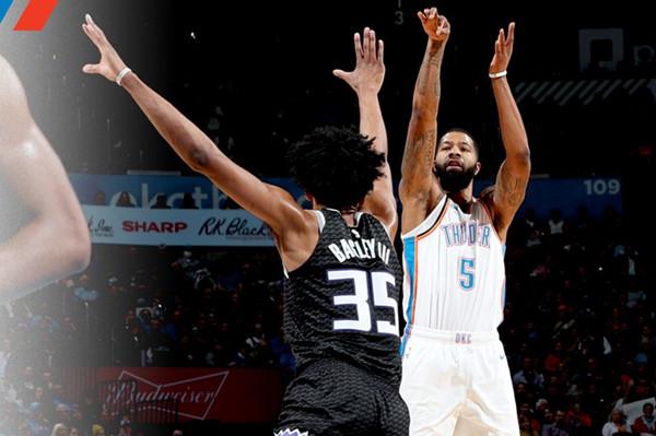 开局乔治暴扣率先拿分又中中投和三分球,博格丹诺维奇连得7分之后希尔德也连续得分,之后威少、亚当斯也有得分,开局双方焦灼,节末巴格利福克斯和伯克斯都有得分,国王一波8-2,首节过后31-24领先。次节国王连续罚球又在篮下多次得分领先了11分,威少和博格丹互彪三分之后国王又连续罚球得分,国王一度领先16分,半场63-49领先。