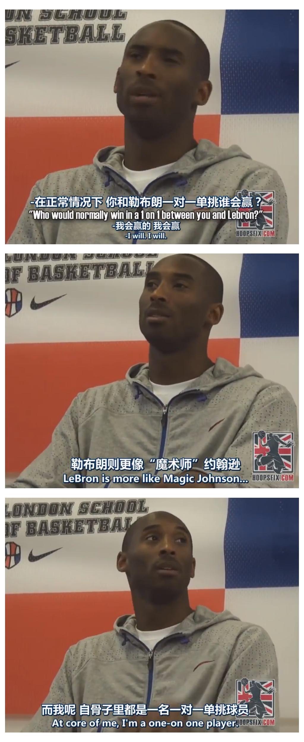科比在接受采访的时候被问到,如果和詹姆斯单挑谁会赢。在这方面科比可没有一点的谦虚,直接说会赢的是自己。看到这里肯定有人觉得是科比盲目的自信,其实并不是这样,科比还给出了自己的理由。他说詹姆斯更像魔术师,强项是组织传球非常全面,而是自己天生就是为单挑而生,就仅仅拿单挑而言,还是科比胜过詹姆斯。