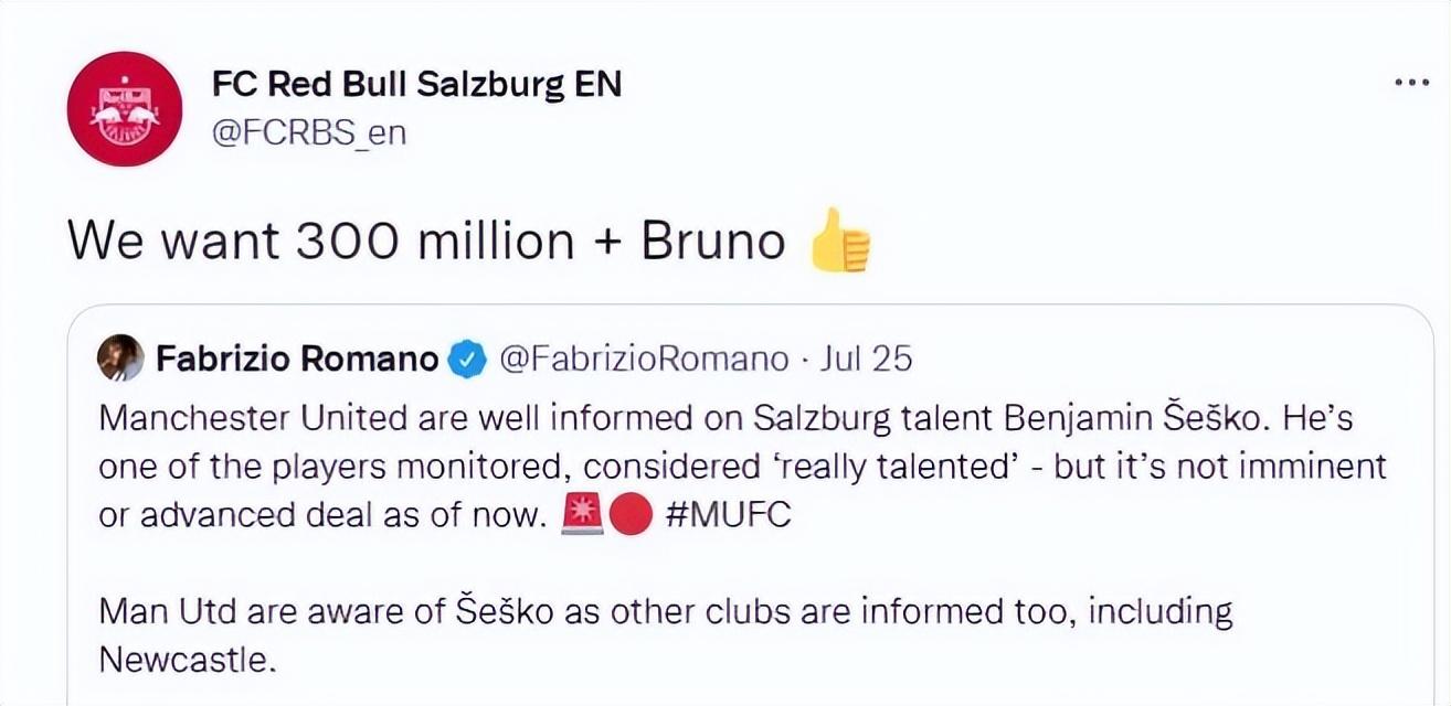 北京时间7月26日,萨尔茨堡红牛官推调侃称,曼联想要19岁前锋塞斯科的话,就直接拿3亿欧元+B费来换。