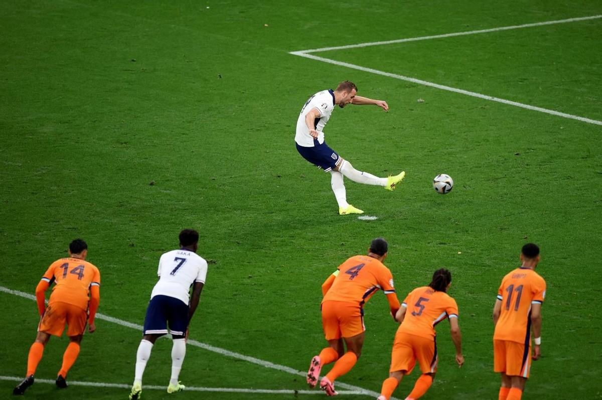 英格兰队并没有因此而乱了阵脚,他们稳扎稳打,积极寻找着机会,第16分钟,英格兰队队长凯恩在禁区内被荷兰队球员邓弗里斯踢倒,经VAR介入后,主裁判判罚点球,凯恩顶住压力,冷静地将点球罚进,为英格兰队扳平了比分,这粒点球也使凯恩超越了法国球星格列兹曼,成为了欧洲杯淘汰赛历史射手王,同时他还以17次出场成为了英格兰队史欧洲杯出场次数最多的球员,创造了属于自己的历史