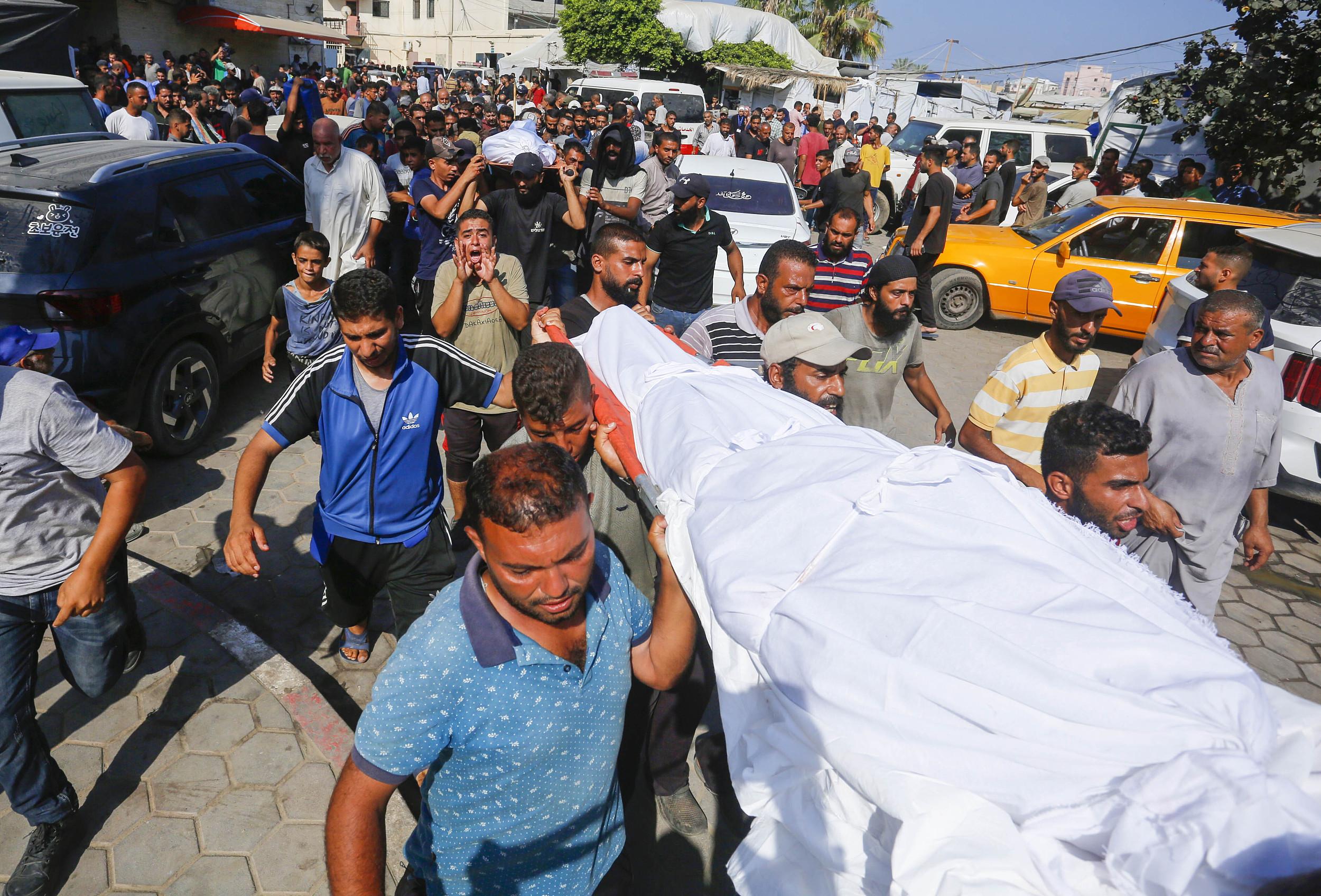 当地时间2024年7月10日,加沙地带代尔拜拉赫,在以色列袭击中丧生的巴勒斯坦人被送往阿克萨医院进行安葬。