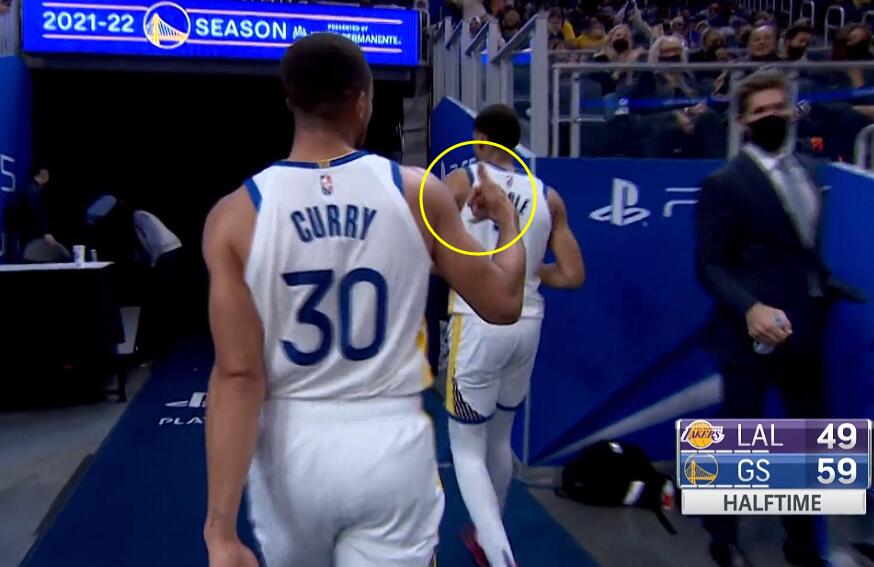 半场结束湖人49-59落后,韦少6投1中拿到了2分7次失误,詹姆斯9分,库里20分,普尔14分,其中三分投篮7投4中。离场时候库里还做了一个打电话的手势。