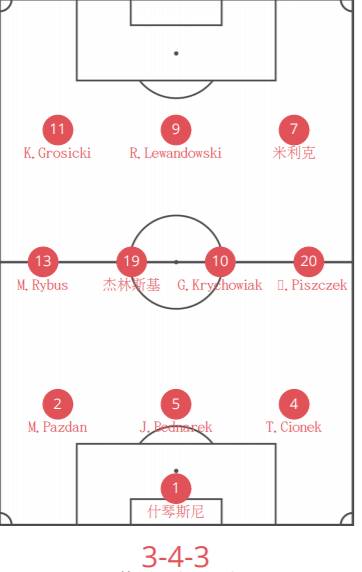 波兰队首发:1-什琴斯尼、2-帕兹丹、4-希奥内克、20-皮什切克、10-克里乔维亚克、11-格罗茨基、13-里布斯、16-布拉什奇科夫斯基、19-泽林斯基、7-米利克、9-莱万多夫斯基