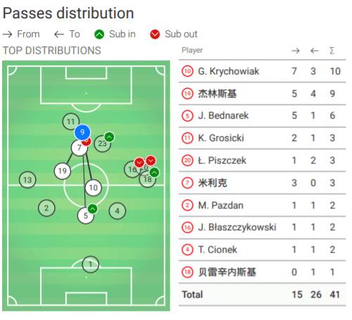 波兰首发:1-什琴斯尼、13-雷布斯、2-帕兹丹、20-皮什切克(83'18-贝雷辛斯基)、4-乔内克、11-格罗西茨基、10-克里霍维亚克、16-库巴(46’5-贝德纳雷克)、19-泽林斯基、9-莱万多夫斯基、7-米利克(73'23-科夫纳茨基)