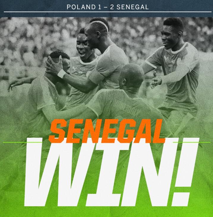 最终,全场比赛结束,塞内加尔队2:1力克波兰队,小组积3分占据出线的先机。