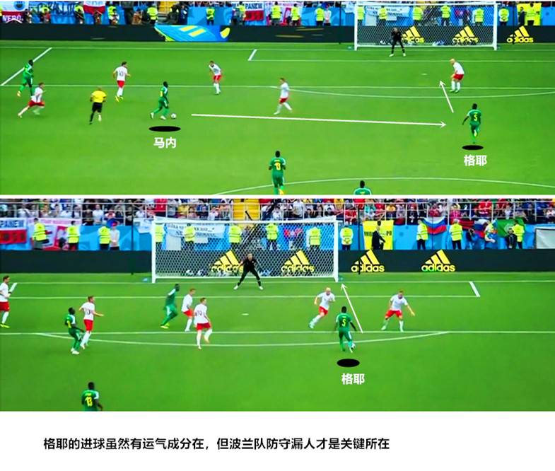 表面上看塞内加尔队进球有一定运气成分,但波兰队在禁区前沿漏人才是关键所在。如上图所示,波兰队在有攻转守时明显出现了失位现象,大多数人的防守重心都集中在持球的马内身上,而前插的格耶几乎无人包夹,这让他拥有了很大的射门空间。
