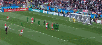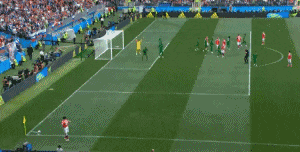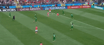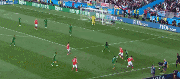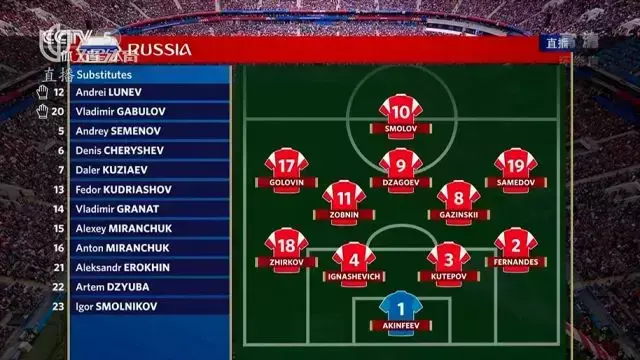 第12分钟,左侧戈洛文起脚传中球,小禁区前沿右侧加津斯基跟进甩头攻门!皮球非入球门左侧,1-0!2018年世界杯首粒进球诞生!