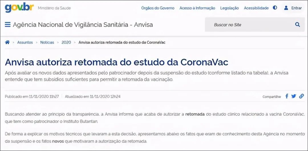 巴西国家卫生监督局决定恢复中国新冠疫苗试验的声明