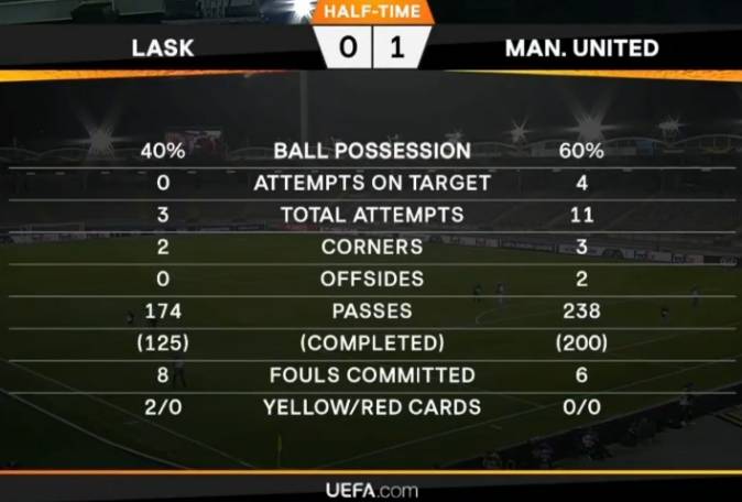 半场战罢,曼联暂1-0林茨。