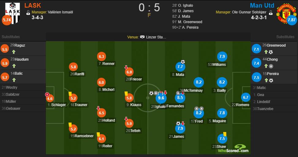 曼联于英超积45分处欧联区,4线近10战不败(7胜3平),上轮联赛2-0曼城赛季双杀同城死敌。LASK林茨6分优势领跑奥甲。阵容方面:索帅排4231,伊哈洛突前,詹姆斯、布鲁诺、马塔任前卫,弗雷德、麦克托米奈担后腰,卢克-肖、马奎尔、拜利、威廉姆斯领后防,罗门罗镇城门。林茨打343,辽足旧将霍兰德先发。
