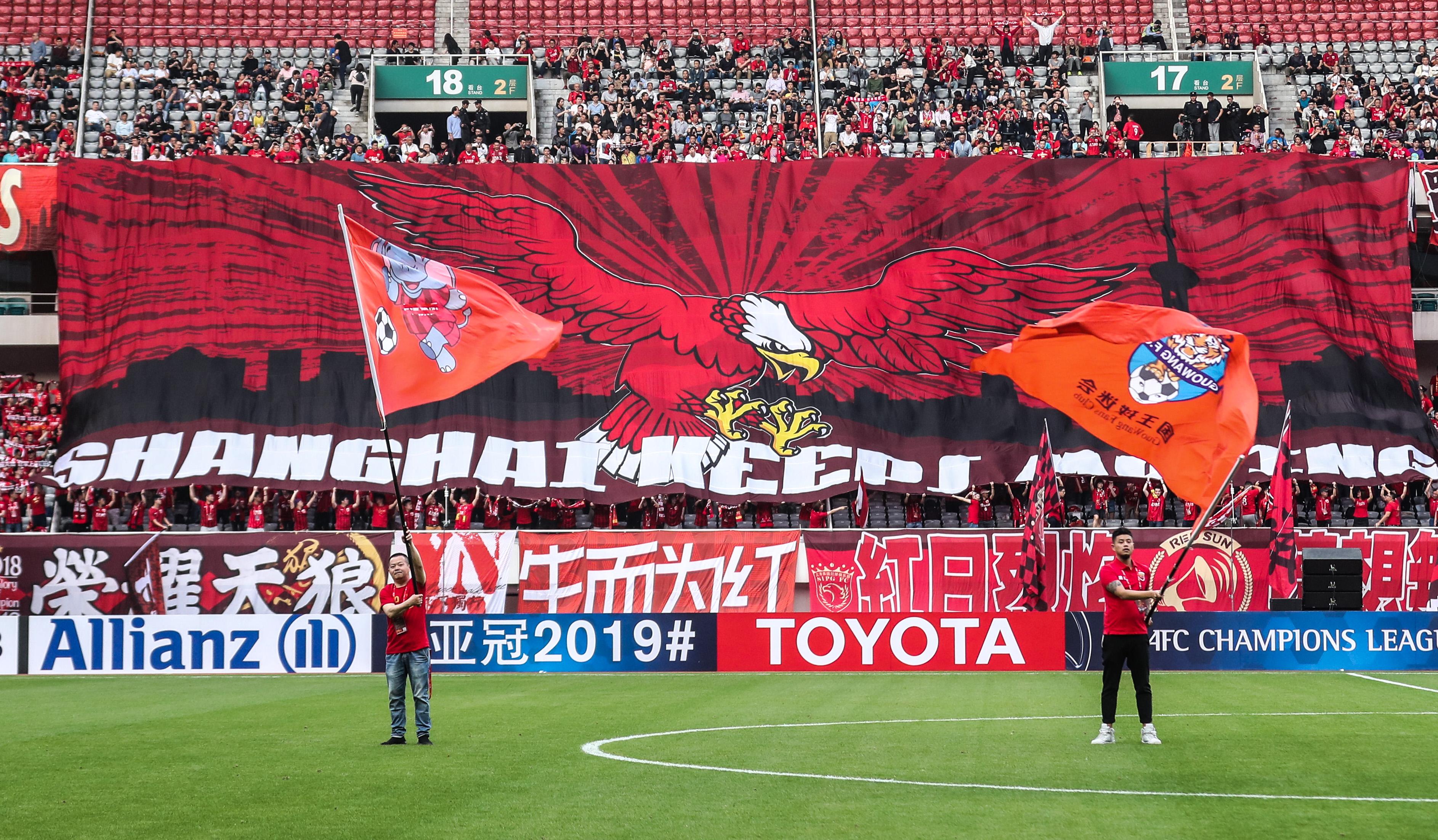 主场看台上,上港球迷打出大型tifo,声援主队。