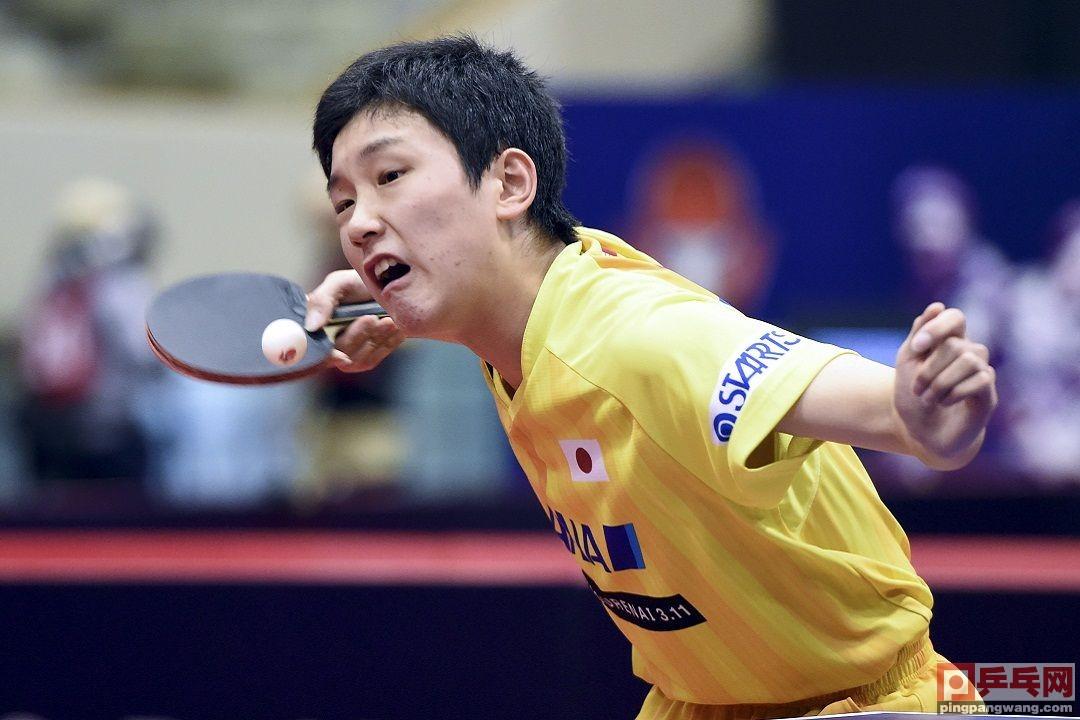 张本智和用反手拧拉下网。