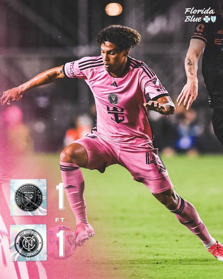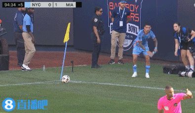 迈阿密遭读秒绝平!第90+5分钟,圣地亚哥主罚角球开出,桑兹力压双人防守高高跃起头球破门,纽约城1-1迈阿密国际!↓