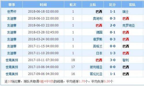 巴西近10场比赛,球队共取得6胜4平0负的战绩,平均进球1.70个,平均失球0.30个。