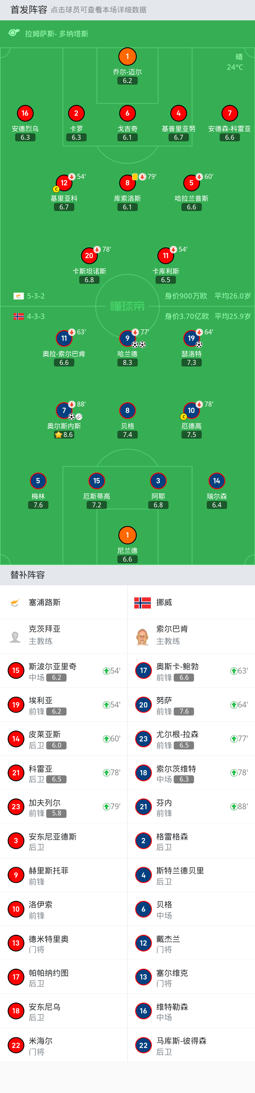 替换下场:64'19-瑟洛特, 88'7-奥尔斯内斯, 78'10-厄德高, 63'11-奥拉-索尔巴肯, 77'9-哈兰德