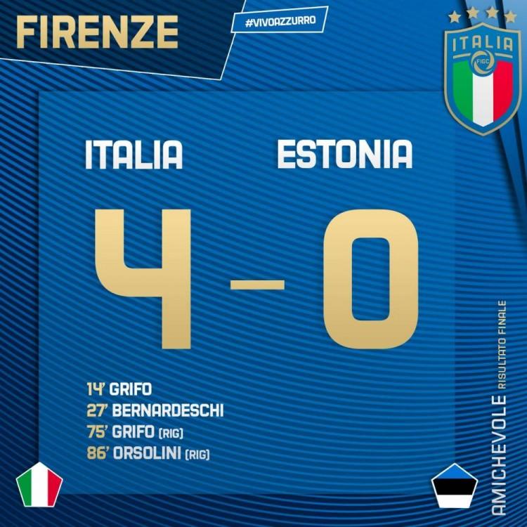 人民网北京11月12日电 北京时间11月12日凌晨3时45分,意大利坐镇弗兰基球场与爱沙尼亚进行一场热身赛。上半场,格里弗破门为意大利首开纪录,随后贝尔纳代斯基破门扩大领先优势。下半场,格里弗和奥索里尼分别打进一粒点球,最终意大利4-0大胜爱沙尼亚。