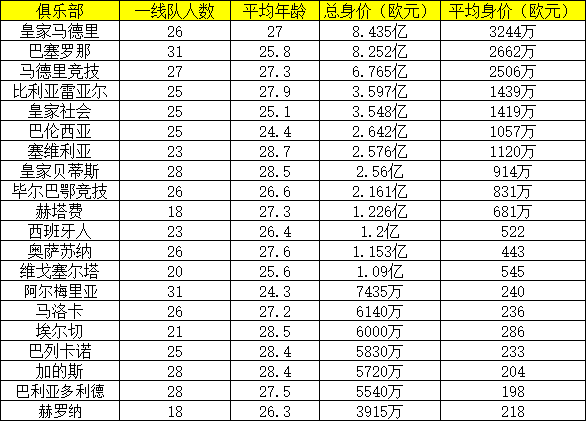 北京时间8月13日,22-23赛季西甲联赛拉开战幕。新赛季西甲平均身价最高的球队依旧是皇马,目前以8.435亿欧元排名榜首。不过本赛季巴萨大幅引援,球员身价直逼皇马,两队身价差距不到2千万欧。相比去年变化最大的莫过于塞维利亚,他们从身价第4跌入第7。