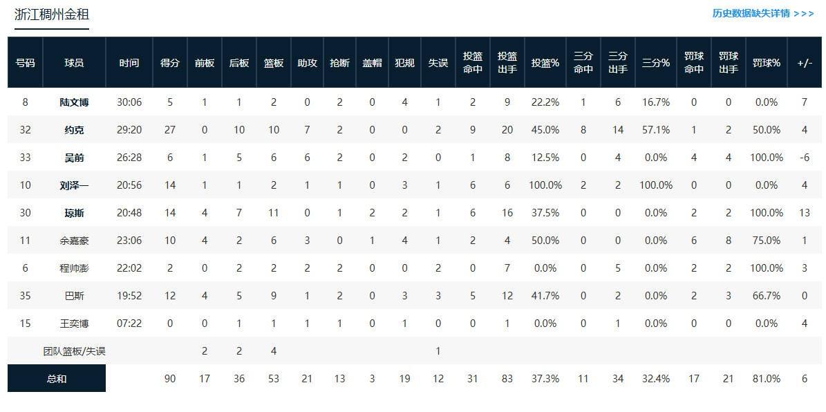浙江:吴前6分6篮板6助攻、陆文博5分、刘泽一14分、琼斯14分11篮板、约克27分10篮板7助攻、余嘉豪10分6篮板、巴斯12分