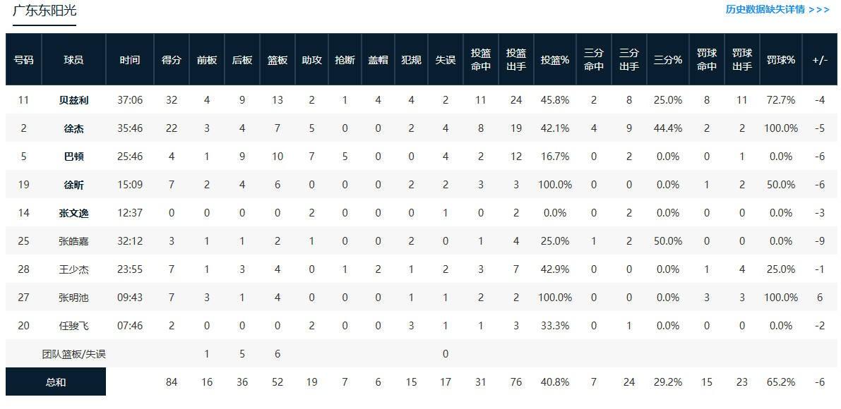 广东东阳光达柳斯-贝兹利32分13板2助1断4帽,徐杰22分7板5助,王少杰7分4板1断2帽;