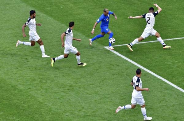 随着比赛深入,哥斯达黎加人不断通过高强度的身体对抗来阻止内马尔。在上半场的最后阶段,每当内马尔拿球,对方就试图上前凶狠防守。除了内马尔,热苏斯同样是对手重点“照顾”的对象。