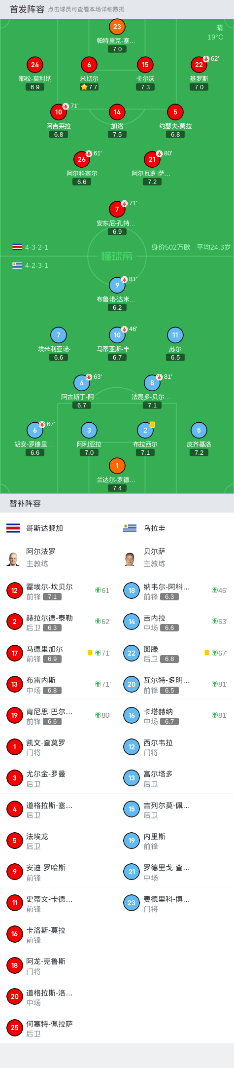 哥斯达黎加出场阵容:1-纳瓦斯、2-阿克斯塔、3-詹卡洛-冈萨雷斯、6-杜阿尔特、8-奥维多、16-甘博阿(75’15-卡尔沃)、5-塞尔索-博尔赫斯、10-布莱恩-鲁伊斯、20-大卫-古兹曼(84’17-特耶达)、11-约翰-维内加斯、21-乌雷纳(54’7-博拉诺斯)