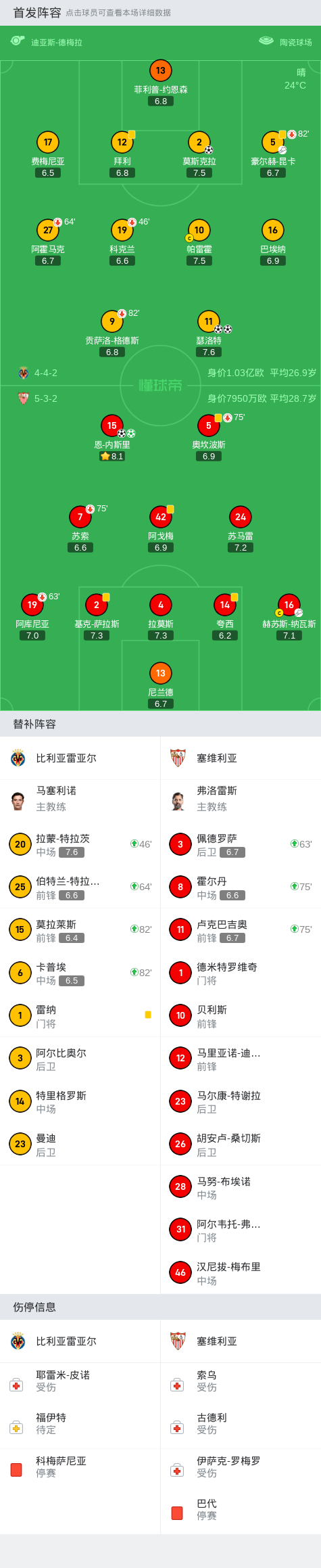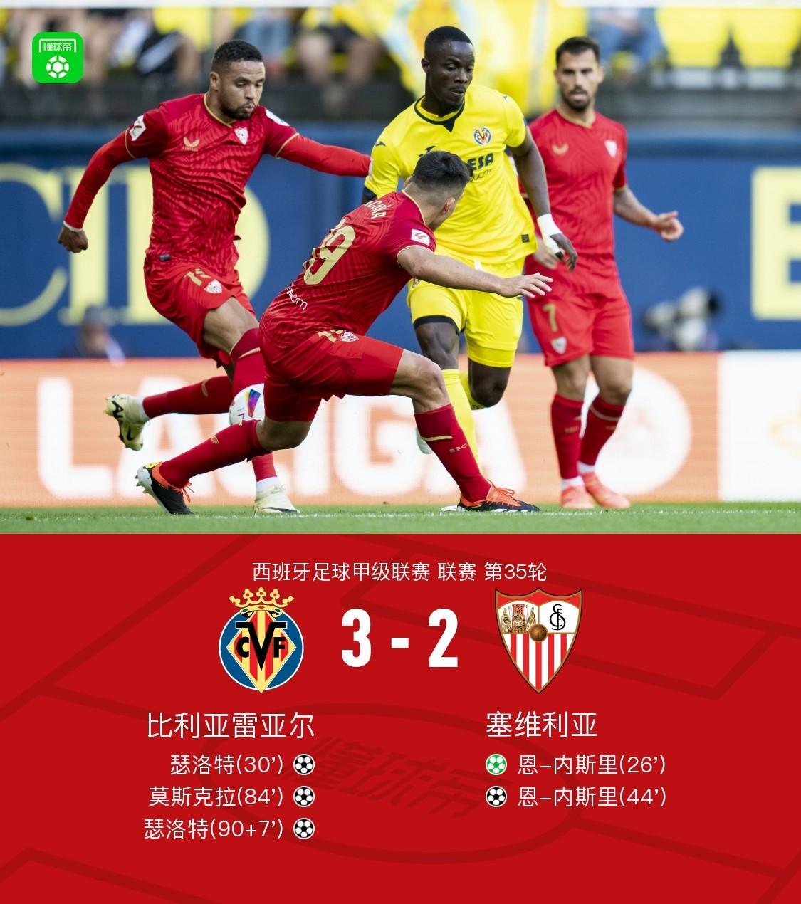 北京时间5月11日西班牙足球甲级联赛联赛第35轮,比利亚雷亚尔主场对阵塞维利亚。上半场恩-内斯里点射破门,瑟洛特头球破门扳平比分,半场结束前恩-内斯里头球破门梅开二度;下半场莫斯克拉破门扳平比分,瑟洛特压哨头球破门上演逆转绝杀的好戏。最终比利亚雷亚尔3- 2逆转战胜塞维利亚。