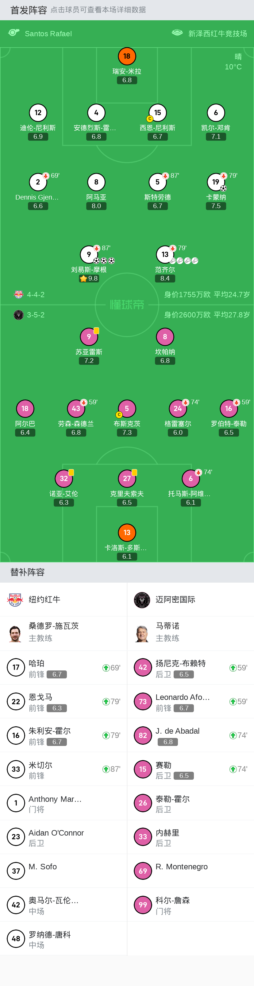 纽约红牛 首发:18-瑞安-米拉, 9-刘易斯-摩根, 6-凯尔-邓肯, 13-范齐尔, 15-西恩-尼利斯, 5-斯特劳德, 4-安德烈斯-雷耶斯, 8-阿马亚, 19-卡蒙纳, 12-迪伦-尼利斯, 2-Dennis Gjengaar