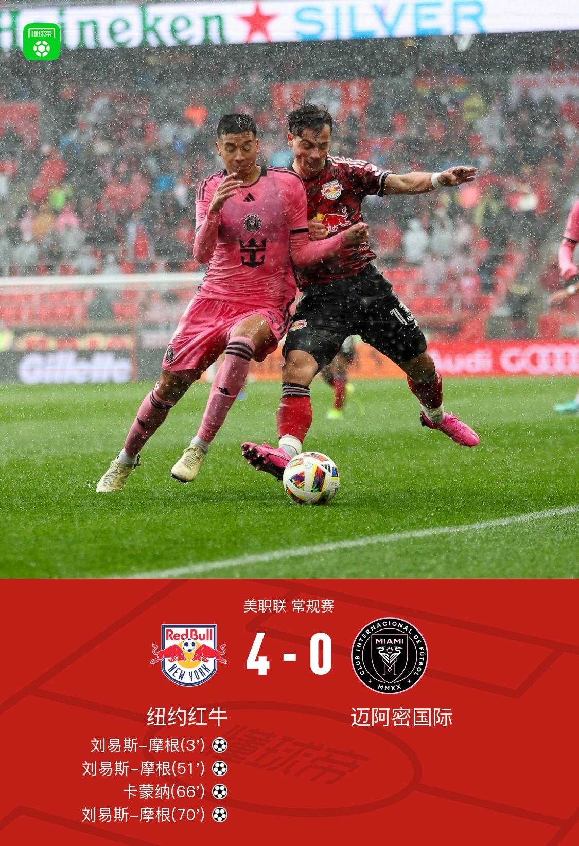 北京时间3月24日美职联常规赛,纽约红牛主场对阵迈阿密国际。上半场开场不久,范齐尔助攻,刘易斯-摩根低射破门。下半场,范齐尔再送助攻,摩根再下一城。随后,卡蒙纳破门锁定胜局。范齐尔横传,摩根推射上演帽子戏法。艾伦挑射破门,但是主裁观看VAR后认定迈阿密国际犯规在先,进球无效。全场比赛结束,迈阿密国际0-4惨败纽约红牛。
