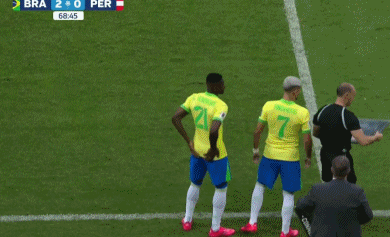 下半场易边再战,第46分钟,罗德里戈禁区前沿左路带球内切后兜射打门,皮球被门将飞身扑出。第54分钟,萨维尼奥禁区右路带球内切时被对手放倒,主裁判再次判给巴西队点球,仍是拉菲尼亚主罚,他打向右下角,门将判断对方向仍鞭长莫及,巴西2-0领先!