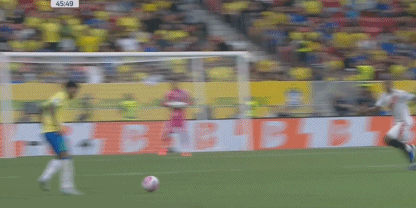 第44分钟,巴西禁区前沿直塞,拉菲尼亚禁区左路得球后挑射打门,皮球被门将出击摘下。上半场比赛结束,凭借拉菲尼亚的点射破门,巴西带着1-0的领先优势进入中场休息。
