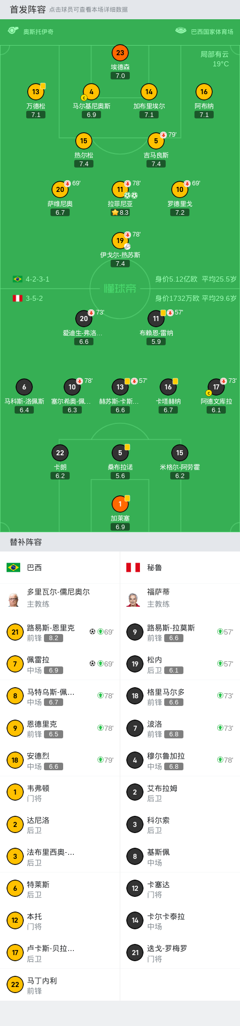 最终,巴西主场4-0大胜秘鲁,取得两连胜,仍位列积分榜第四。