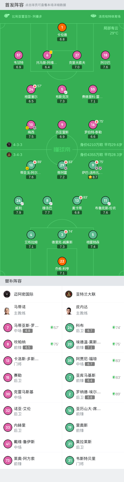北京时间5月30日美职联常规赛,迈阿密国际主场对阵亚特兰大联。比赛第44分钟,萨巴-洛布扎尼泽轰进一脚世界波,第59分钟,萨巴-洛布扎尼泽远射再下一城,第62分钟,梅西接布斯克茨助攻打进贴地斩,第73分钟,蒂阿雷门前轻松得分。最终比分迈阿密国际 1- 3 亚特兰大联。