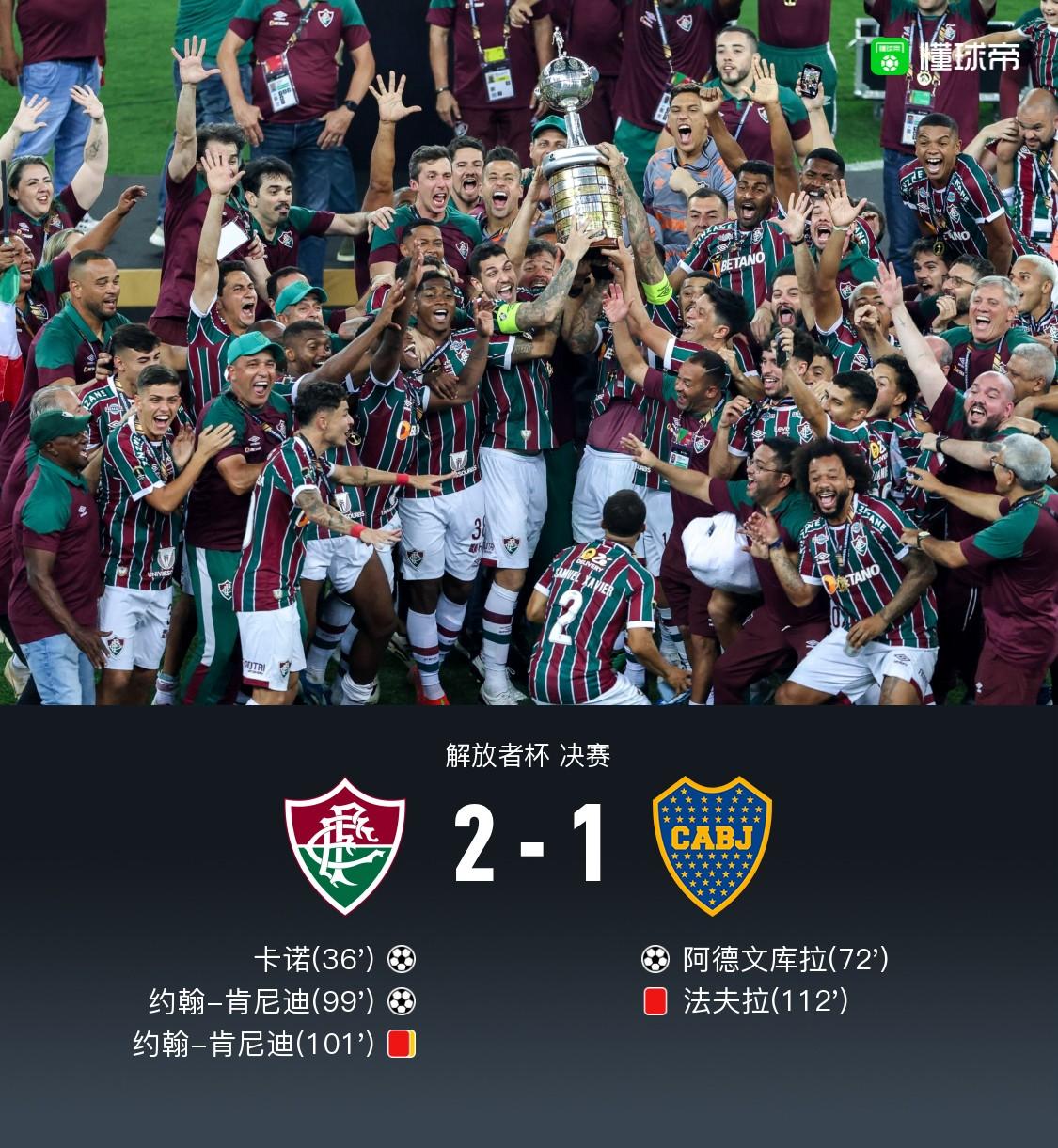 北京时间11月05日解放者杯决赛,弗鲁米嫩塞对阵博卡青年。上半场,卡诺破门为弗鲁米嫩塞取得领先。下半场,阿德文库拉突施冷箭帮助博卡扳平比分。90分钟战罢,两队1-1平进入加时赛。加时赛中,约翰-肯尼迪抽射破门,但是因为冲入球迷激情庆祝被出示第二张黄牌罚下。随后,法夫拉在冲突中掌掴对手也被罚下,两队人数回到同一起跑线。全场比赛结束,弗鲁米嫩塞2-1力克博卡,队史首次赢得解放者杯冠军。
