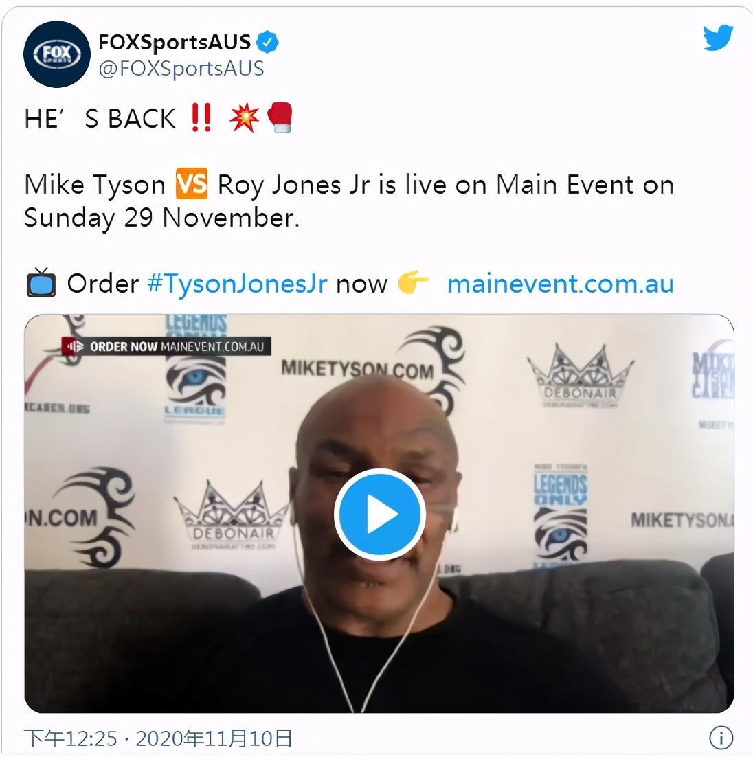 现年54岁的前世界重量级拳王迈克·泰森(50-6,44KO) VS 51岁的前四个级别世界拳王小罗伊·琼斯(66-9,47KO),赛制采用8个回合的表演赛,两人争夺WBC定制的“特别”金腰带。比赛付费直播,这样的表演赛是情怀,更是为了慈善!