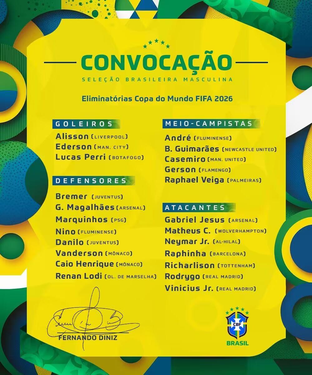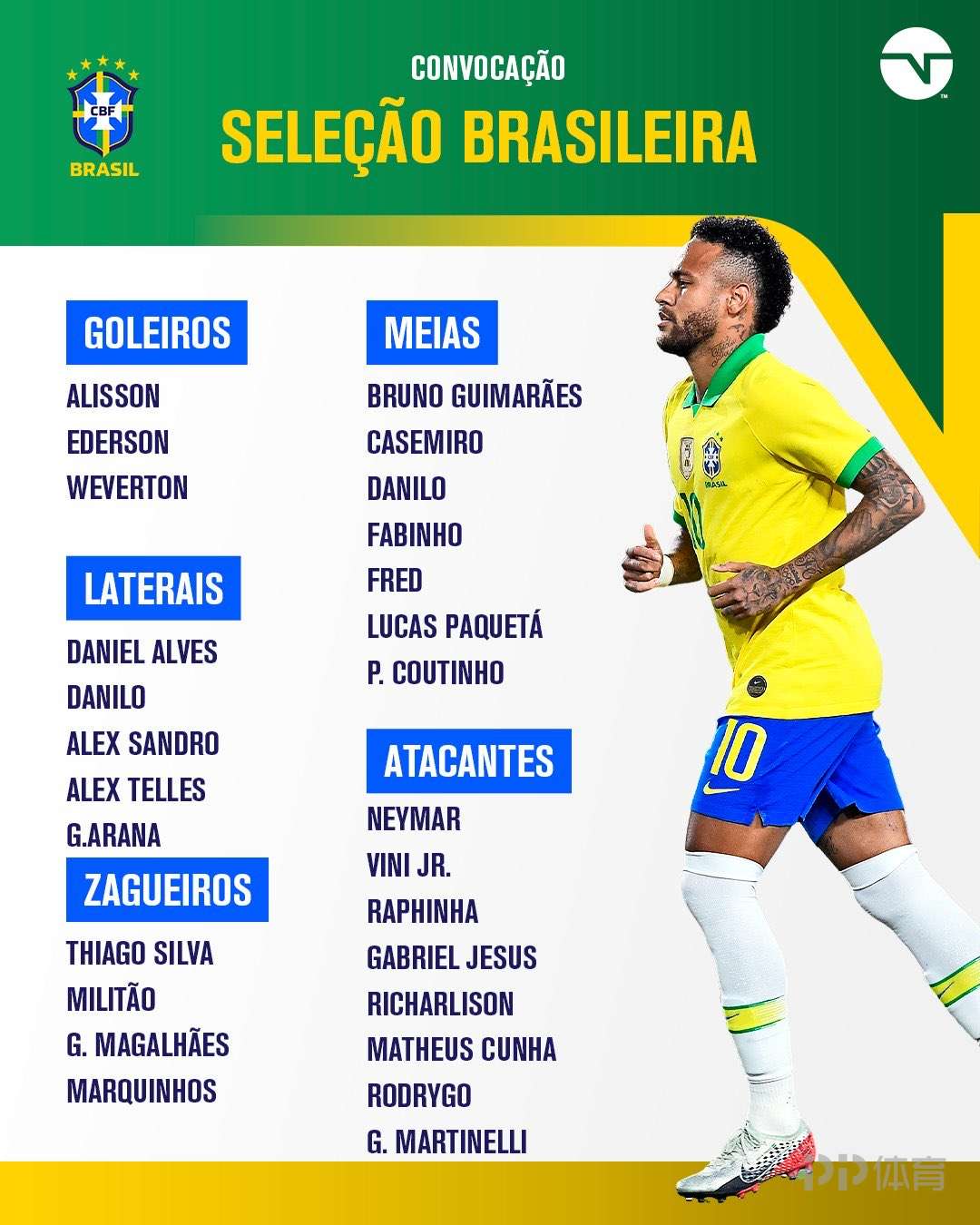 北京时间5月11日消息,巴西足协官方公布了最新一期国家队大名单,内马尔、维尼修斯领衔,阿尔维斯、罗德里戈入选。