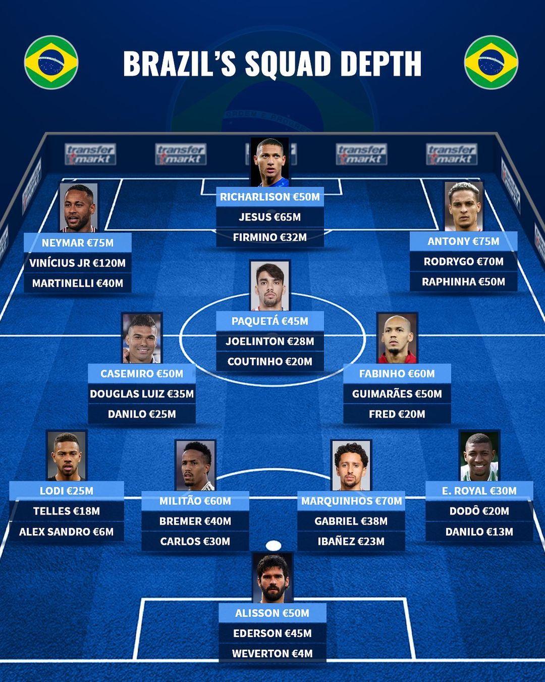 前锋:内马尔(维尼修斯、马丁内利),理查利森(热苏斯、菲尔米诺),安东尼(罗德里戈、拉菲尼亚)